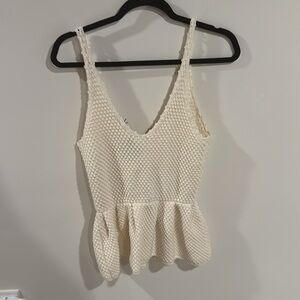 A thick crochet knit tank is juxtaposed with a flirty peplum hem to create a flattering silhouette.