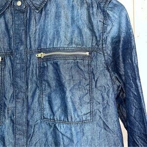 Stylish denim shirt with long sleeves and zipper pockets. Perfect for casual wear.
