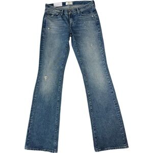 Our iconic low-rise original bootcut continues to be a favorite. Beaded floral embellishments on the back pockets add a touch of luxe to this pair. Crafted from super soft rigid denim, with a medium blue wash the whiskering, fading, and well-placed destruction make them feel like a throwback to a well-loved pair. A slim fit through the thighs and a bootcut flare at the hem always create a sophisticated silhouette. Wear with anything but pair with the matching cropped trucker to make a statement.