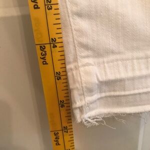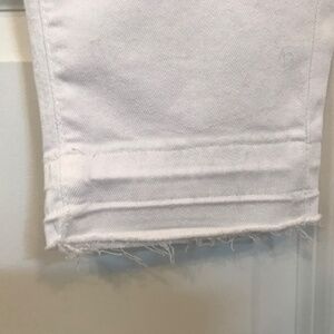 5 pocket slim fitting white cropped jean with raw hem-which adds a contemporary flare.