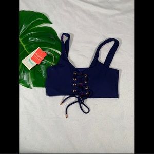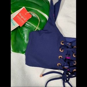 This bikini top is like getting four in one with a cute lace-up detail to wear in front or back, and a vividly striped side that reverses to a ribbed solid.