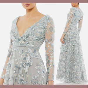 NWT$798 Mac Duggal [ 10 ] Embellished V-Neck Long Sleeve A Line Gown Silver S763