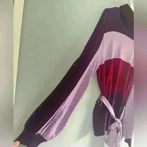 Colorblock. Removable tie waist. Long sleeve with elastic cuffs. Turtleneck. Lightweight. Lots of stretch.