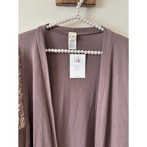This is a women's NWT brown open front cardigan sweater with dolman sleeves and sequins on the sleeves from 7th Roy, size Small. Very soft sweater.