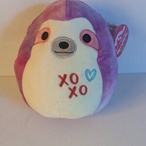 Super cute, 8" collectible Squismallows Sharie the sloth plushie with pink tie dye, a white belly, featuring embroidered red XOXOs with a blue outline heart on her belly. This awesome collectible Squishmallow stuffed animal is in perfect new with tags condition. A great Easter or Spring birthday gift, or add it to your collection!
