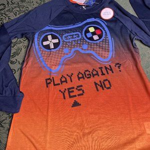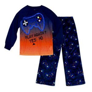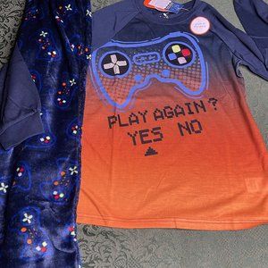 NWT 8 glow in the dark gaming console PLAY AGAIN pajamas christmas birthdays tween present fit glowing glows wonder nation set include blue pajamas shirt top with orange game console consol long sleeve reads PLAY AGAIN pajamas have matching pants warm minx fur with space techie print on rainbows multi colors consoles back to school sleeper sleepovers birthday gift present easter christmas hanukkah passover kwanzaa valentines day at patricks day jammies matching brothers boys twins