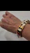 NEW vintage 80s Swarovski goldtone hinged bangle bracelet featuring a vibrant, multi-color enamel design and crystal embellishments. The bracelet has a wide band with an off-white base enamel and is decorated with abstract, geometric shapes and lines in various colors, including red, black, blue, and yellow.