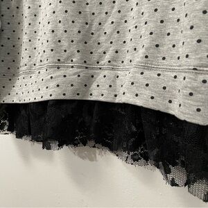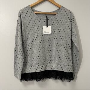 NWT 89th & Madison Womans Polka Dots Lace Top S SMALL New with Tags Stretch; Gray with Black polka dots; long sleeves; soft; lace detailing at the hemline