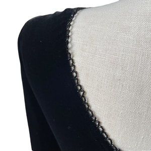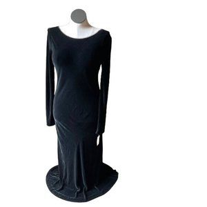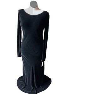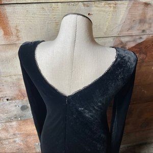 -FEATURES: black velvet dress with a maxi skirt, slit in the back, long sleeves and a deep boat scoop neckline. It has beading on the neckline. Chic, elegant, simple, and timeless! Authentic 1990’s designer vintage, sold at Bergdorf goodman for almost $500!