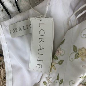 Description: Stunning NWT NOS unworn strapless fairytale romantic wedding gown. Strapless with ruffle tulle at the neckline and down the corset style panels, upper bodice also has lovely pastel floral embroidery. Skirt is flouncy fancy white tulle. zips in back, fully lined.