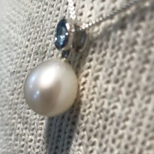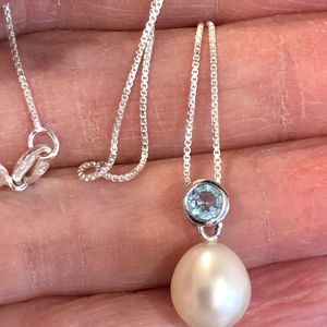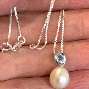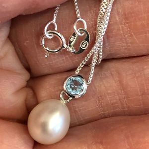 NWT 926 Floating pearl with blue stone on a 16 inch box chain it’s so special and so pretty the charm is removable so if you want to take it off and hang another charm you can check back on my charms and purchase some charms to go with it have a great weekend
