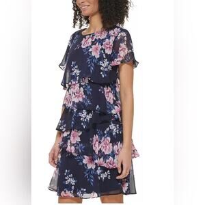 NWT $99 Short Sleeve Tiered Ruffle Chiffon Floral Dress 4 Petite wedding Party