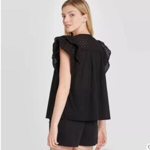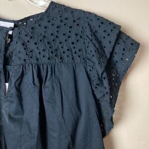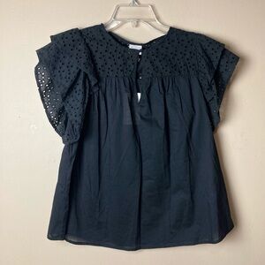 A new day short sleeve eyelet design top. Feminine layered ruffle flutter sleeves. Keyhole cutout. Sheer. New with tags, size small.