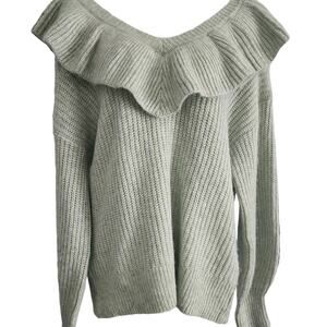 Features: soft knitted vertical cable design, v-neck in front with large ruffle in front an back, long sleeve, long sleeve, oversized design and oversized sleeves.