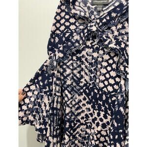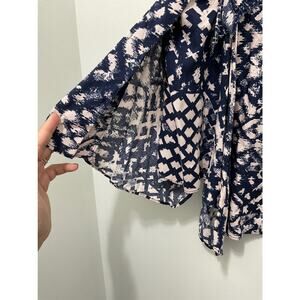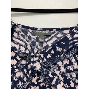 NWT a pea in the pod Maternity top printed throughout navy blue and blush pink tank asymmetrical camisole blouse with adjustable straps and ruffle details.