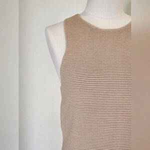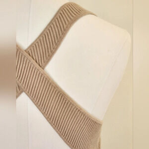 This is a darling jumper! It's new with tags by Abercrombie & Fitch in a light neutral tan and in size large. This is slim fitting in an elevated knit fabric featuring all-over ribbed detail, cut out detail at back with a scuba style neckline and cross back straps. This wld be cute with a white collared shirt, or casual with a t shirt and denim jacket.