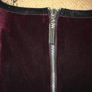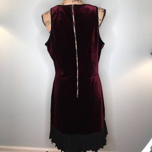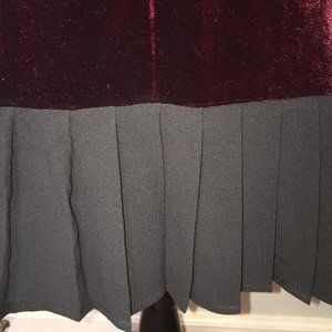 Beautiful maroon velvet a-line knee length (or slightly above the knee depending on height) party dress with pleated chiffon hem by A.B.S. Collection Allen Schwartz. Perfect for any holiday party! Zip back closure, new with tags. Measurements available upon request.