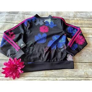 NWT. Adidas. Size M(10/12). Black tricot jacket with bright multi color flowers. Ribbed collar, waistband. cuffs. Zip front. Long sleeve. 2 front pockets. Logo on front.
