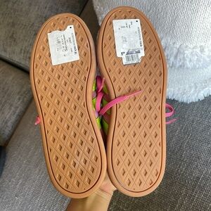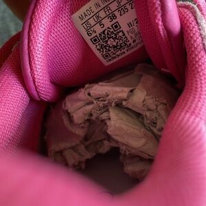 Eye-catching Adidas sneakers in vibrant pink with neon yellow stripes. Ideal for a standout style.