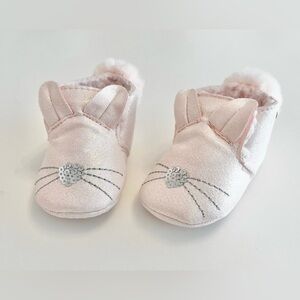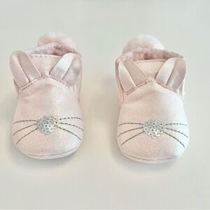 Nicole Miller NY soft pink iridescent baby moccasins with bunny ears, heart sequins nose, whiskers, and fluffy bunny tail. Soft sherpa interior lining.