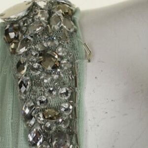 Embellished with glistening beads hand sewn on to shoulder straps. Elegant V neckline & back with a delicate and airy floor length chiffon skirt. Back zip. Imported. Unaltered. Color is Mint. Perfect for a spring or summer wedding.
