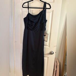 NWT ADRIANNA PAPELL SATIN BLUE CREPE ONE SHOULDER DRESS Elegant Navy