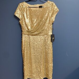 NWT ADRIANNA PAPELL WO SIZE 10 SHORT SLEEVE MIDI GOLD SEQUIN COCKTAIL DRESS