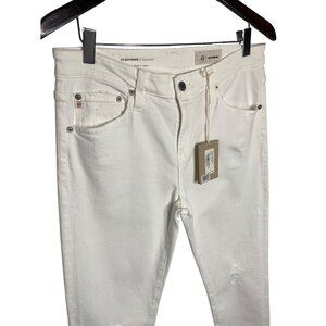 NWT, no flaws, size 28. AG Adriano Goldschmied Ex Boyfriend Slim 1 Year Vivid White Jeans. Zip fly with button closure. 5-pocket styling. Intentionally destroyed detail - distressing may vary. 98% Cotton/2% Polyurethane