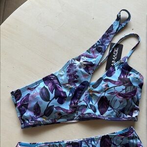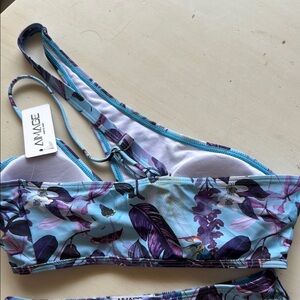 New with Tag - AI’Mage 3 piece swimsuit (sz small). The double straps lay on the left side of your body. The skirt is thin mesh like fabric. Please see all photos.