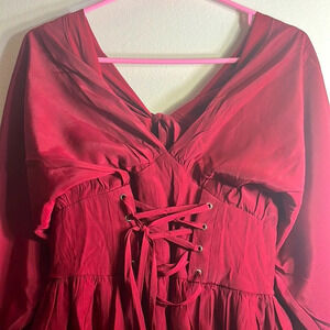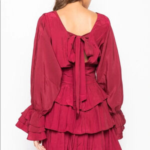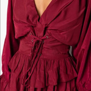 Description: brand NWT gorgeous dress made from an airy and lightweight fabrication. This dress features a lace up corset waist, a deep v neckline, long sleeves, a layered ruffled detailing along the skirt and wrists, a back tie detail, and a back zipper closure 💃🏽