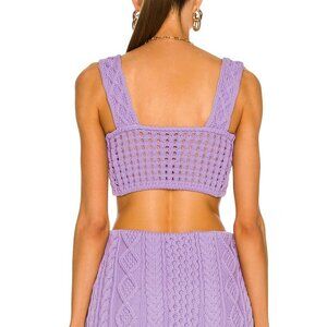 100% nylon. Made in China. Dry clean only. Open-knit pointelle panels at bust and back. Chunky cable knit fabric.