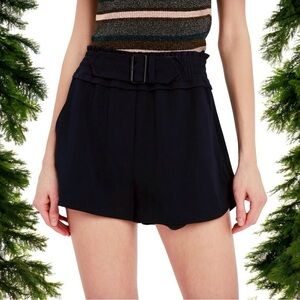 High rise crepe shorts with an attached buckle belt to cinch the elasticized waist. Side pockets. Back patch pocket. Pull-on style. Tonal hardware. Unlined. In black.