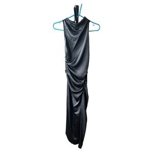 Textured satin strapless dress with sophisticated banded collar, draped down in a ruched seam with side slit.