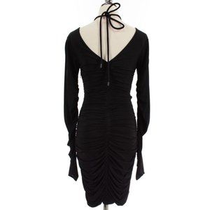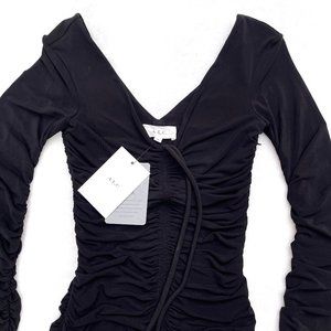 Gorgeous! NWT $A.L.C Violet Ruched Stretch-jersey long ruched sleeves Double v neck Mini Dress In Black XS. Dress stretch-jersey ruched ties at neck fully lined stretchy fabric mid-weight fabric dry clean imported, Side zipper closer. Nylon blend. Length apx: 31", Chest 14"