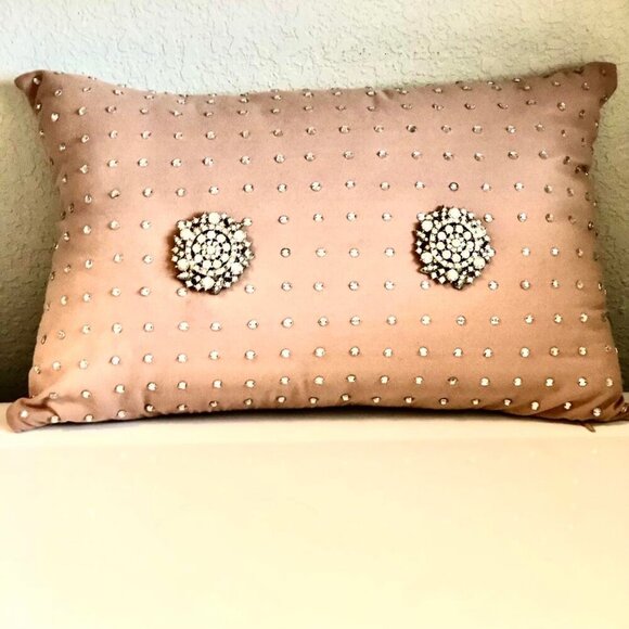 Stunning Heirloom Boudoir Accent Pillow encrusted with sparkling crystal Rhinestones and 2 large dazzling Rhinestone Jeweled Broches on a beige soft brushed cotton fabric ...