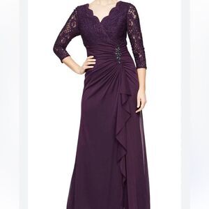 A plummy gown offers the elegance of a lacy bodice and a sweeping skirt, while occasional crystals add extra special sparkle.