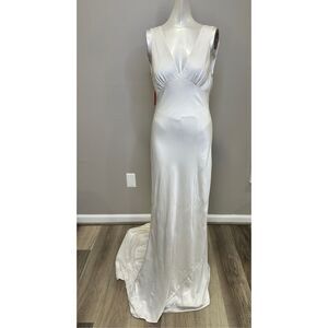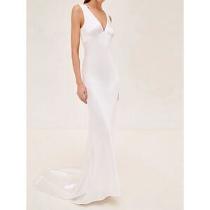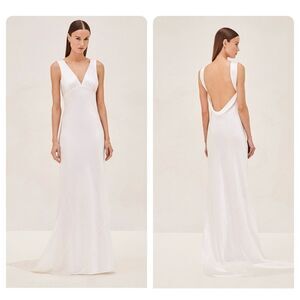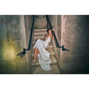 The Celine Dress boasts an open-back silhouette and form-fitting design, a graceful train addition for an elevated drama, and an exquisite texture that embodies sophistication. This dress is crafted with luxury in mind, offering a timeless and classic look that will flatter and highlight the wearer's natural figure.