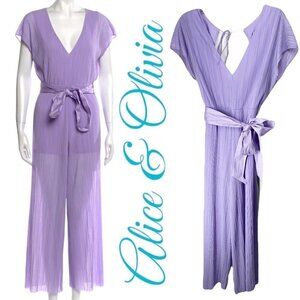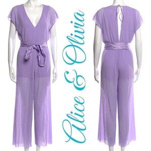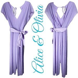 NWT ALICE & OLIVIA Mitsue Plissé Pleated Lavender Pastel Open Back Sheer Wide Leg Belted Jumpsuit, Size 2