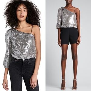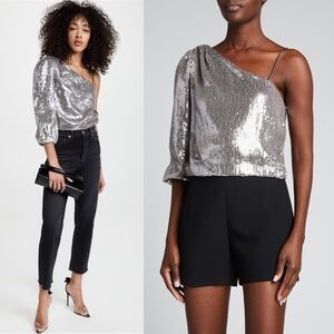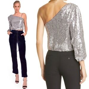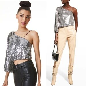 NWT ALICE + OLIVIA Silver Sequin Puff Long Sleeve One Shoulder Draped Crop Top L