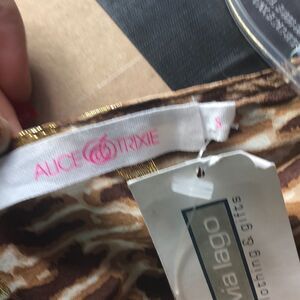 NWT Alice & Trixie silk tank top. With a The tank top being low in the front and high in the back. It’s got a gorgeous weaved braid of brown and gold on the front of the shirt. The top is an adorable animal print