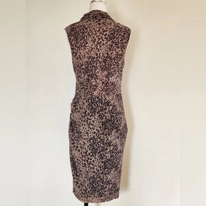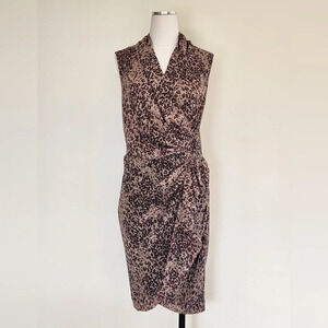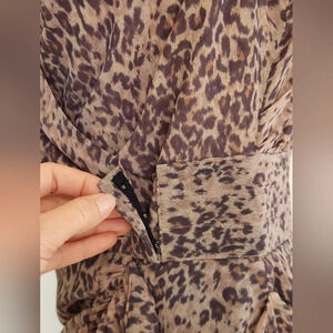 Beautiful All Saints dress, new with tags in size 8. This is the Cancity Patch dress in camel brown with an animal print. This is a midi length wrap dress with a v neck. At the waist, the wrap connects with 3 hook and eye clasps, and also again on the inside. Off of the waistline, on the left hand hip, there are ruffles flowing down the wrap hemline. The skirt is lined, the bodice has a double layer.