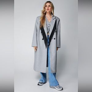 Layer up. Feel ready to seize the day in our longline coat, made in high quality wool blend fabric, with a flattering, oversized fit and a swinging fringe trim. Our oversized wool blend coat is a versatile closet staple, and pairs well with joggers, jeans, and casual dresses, taking you from the office to after work dinner and drinks. Premium Wool Blend Fringe Coat High Quality Wool Blend Fabric Ultra Flattering Oversized Fit Statement Fringe Accent Classy Longline Design Button Front Fastening Sleek, Minimal Design Model wears a size M (US size 6/UK size 10). 70% Polyester, 20% Wool, 7% Acrylic, 3% Other Fibers, Trim: 100% Polyester: Dry Clean Only