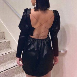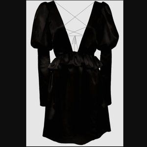 ALLINA LIU Black Satin Celene Dress Sz 4 Deep V Neck Front with Lace Up Back