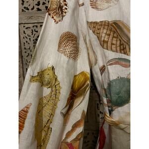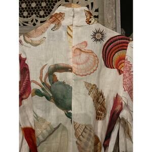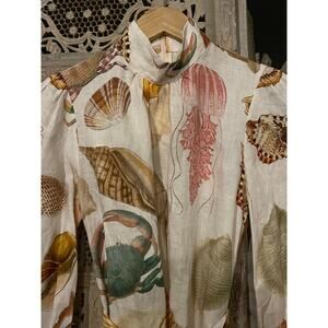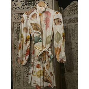 The Atlantis Smock Mini Dress is from our Pre-Fall 2021 collection. Featuring an exclusive vintage sea life print on a sustainable linen base. The sophisticated silhouette is framed by a high neck paired with full length balloon sleeves, gathered hem and self-tie belt.