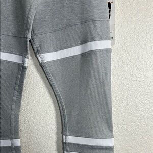 Comfortable and stylish leggings in gray with white stripe accents. Perfect for everyday wear.