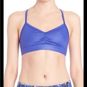 A light support bra that works hard in yoga class but plays nice afterward—particularly under a track jacket, half-zipped to show off the sweet ruched detail.