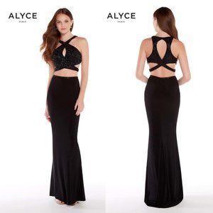 NWT ALYCE PARIS Women's Black Maxi Long Gown Wedding Sparkle Beads 2 PC Features - Sleeveless, 2-piece jersey prom gown that has a beaded crop top, Halter, Keyhole neckline, Long two piece dress with a bodycon skirt, Cut out sides, Open back Strap, Padded Bust, Sparkle, Back zip