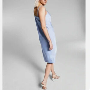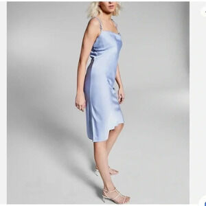 Dress features side slits, a drape neckline and beautiful blue color (almost periwinkle)