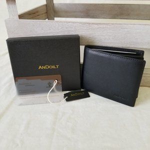 NWT! ANDOILT Black Leather Bifold Slim Wallet w/RFID Blocking and Storage Pouch