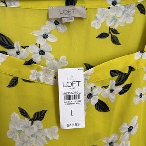 Gorgeous bright yellow/chartreuse Loft blouse, perfect for tucking into a high waisted pair of jeans or a skirt, good for the office, beautiful floral print with dogwood blooms and touches of blue.